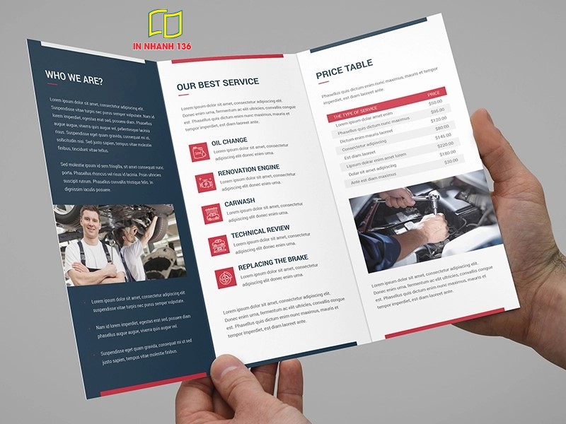 Thông tin trên tờ gấp 3 sẽ giúp khách hàng của bạn có cái nhìn thoáng qua về công ty của bạn theo các đáng nhớ và hiệu quả trong khi vẫn cũng cấp đủ thông tin để họ có cảm nhận tốt về thương hiệu của bạn.